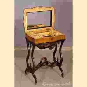 Proponuję Państwu niciak - stolik do robótek ręcznych wykonany w stylu Willem III – odmiana holenderskiego Ludwika Filipa z lat 1[zasłonięte]850-18, orzech z czernionymi elementami tzw. ebonizowanie. Widoczne wpływy Neo-Rokoko w stylizacji ornamentów mebla.