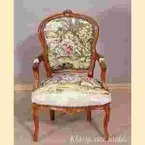 Konstrukcja fotela wykonana z drewna, tapicerka gobelinowa.