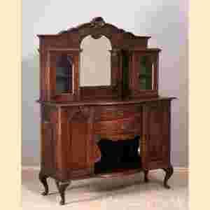 W górnej części kredensu znajdują się przeszklone nadstawki - witryny, a pomiędzy nimi fazowane lustro.