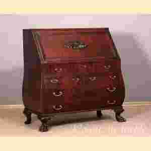 Komoda z odkładanym blatem o niezwykłym kształcie. Wygięcie płaszczyzn mebla jest bardzo widoczne. Zarówno przód jak i boki profilowane. W dolnej części komody falowany przód jest podzielony na szuflady z obrzeżeniem i zamknięty wypukłymi narożami. Falisty fartuch łączy dwie nogi. Przód i naroża o falistej linii nadają meblowi monumentalności. Wewnątrz części z blatem liczne szufladki i skrytki oraz półeczki na dokumenty.