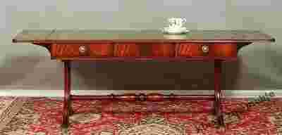 Piękny klasyczny stolik - klapiak z dodatkowymi blatami bocznymi, fornirowany drewnem mahoniowym. Blat ławy oryginalnie wyłożony skórą naturalną.