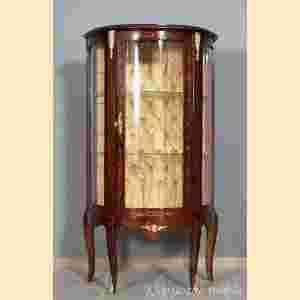 Proszę zwrócić uwagę na wykończenia mebla i wszystkie dekoracje. Mebel wykonany z wielką dbałością o każdy szczegół. Materiał tapicerski pięknie pikowany, mosiężne aplikacje w motywy roślinne, intarsjowane drzwi, fornir układany w piękny wzór, gięte szyby.