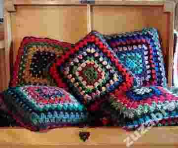 - wykonane są z wielokolorowych włóczek - głównie z miękkiego akrylu i przyjemnej niegryzącej wełny. Poduszki mają wkład jaśka w bawełnianej poszewce z poliestrowym wkładem.