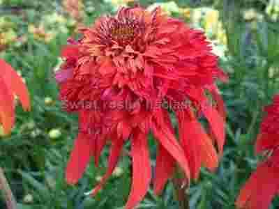 Jeżówka Hot Papaya - bardzo lubiana, wesoła, energicznie rosnąca odmiana o jaskrawych,mocno pachnących pełnych kwiatostanach. Hybryda odmian Meringue i Pink Double Delight. Kwiaty są duże (średnica ok. 8,5 cm), bez tendencji do blaknięcia. Wspaniały widok, kiedy rosną jeżówki tej odmiany w grupach, np 3-4 sadzonki obok siebie. Bujny pompon otoczony dłuższą spódnicą ceglastych płatków o ton jaśniejszych od reszty. Intensywny kolor wręcz bije po oczach. Odmiana długo i bujnie kwitnąca. Tworzy w krótkim czasie silną kempę mocnych soczyście zielonych liści i łodyg z bordowymi znaczeniami. Ścięte kwiaty mogą w wazonie stać nawet 2 tygodnie. Osiąga ok. 80-90 cm wysokości i ok. 65 cm średnicy.