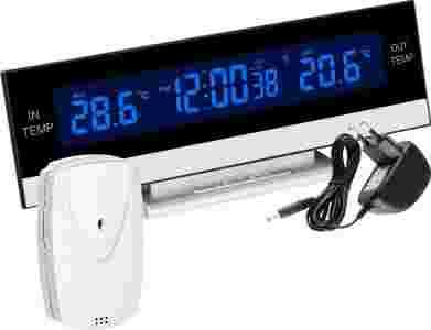 Stacja pogody o nowoczesnym wyglądzie przeznaczona do pomiarów wewnętrznych i zewnętrzny wartości temperatury.