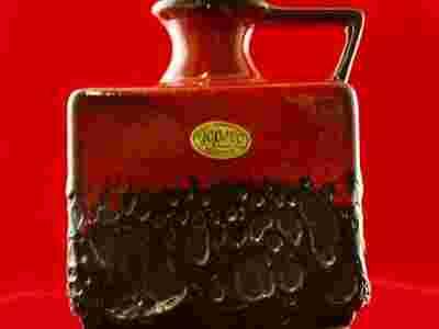 Wazon wykonany z doskonałej jakości ceramiki w przepięknym połączeniu barw:czerwieni i czerni.Dolna część wazonu o ciekawej ,wyczuwalnej,wypukłej strukturze typu lawa,górna część w postaci gładkiego,błyszczącego szkliwa.Całość przełamana świetnie wymodelowanym uszkiem.Uwagę zwraca geometryzująca forma oraz doskonała jakość wykonania.Wazon posiada etykietę świadczącą o oryginalności.