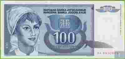JUGOSŁAWIA 100 Dinara 1992 P112 UNC AA Kobieta