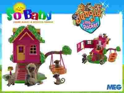 Składany domek dla małpek, w którym mieści się salon, sypialnia. Do gałęzi przyczepiona jest huśtawka z opon. W zestawie z mamą małpką i trzema małymi małpkami.
