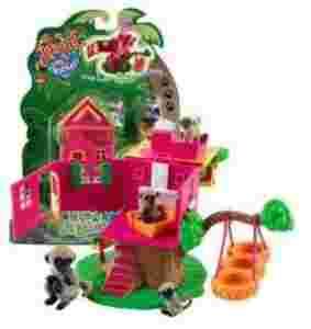 Składany domek dla małpek, w którym mieści się salon, sypialnia. Do gałęzi przyczepiona jest huśtawka z opon. W zestawie z mamą małpką i trzema małymi małpkami. Zabawka przeznaczona dla dzieci powyżej 4 lat.