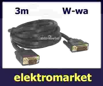 Kabel DVI - VGA o długości 3m, podwójnie ekranowany, z jednej strony zakończony wtykiem DVI-D a z drugiej wtykiem VGA (D-SUB 15 PIN), wtyki pozłacane, kabel w kolorze czarnym. Zastosowanie podwójnego ekranowania niweluje wszelkie zakłócenia o dużym natężeniu mogące mieć wpływ na jakość wyświetlanego obrazu.
