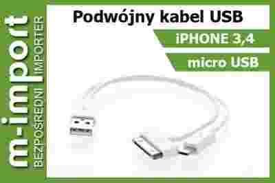Kabel USB 2 w 1 zawiera złącze, które używane jest w urządzeniach firmy Apple oraz złącze microUSB, wykorzystywane we wszystkich urządzeń wyposażonych w wejście microUSB, czyli np. m. in. telefonach komórkowych Sony, HTC, Nokia, LG , odtwarzaczach mp3 Sony, Philips, Creative, Manta, nawigacjach GPS GoClever, NavRoad i wielu innych. Kabel 2 w 1 umożliwia ładowanie przez port USB w komputerze nawet 2 urządzeń jednocześnie. Użycie kabla nie wymaga instalowania sterowników. Jest on kompatybilny z portami USB 1.1 oraz 2.0, co zapewnia współpracę z nowymi, jak i nieco starszymi komputerami. Kabel współpracuje ze wszystkimi systemami operacyjnymi. Jest wykonany z wysokiej jakości materiałów, co zapewnia sprawne i długotrwałe działanie.