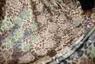 Dość gruba tkanina tkana splotem atłasowym. Jednostronnie malowana we wzór przypominający skórę pantery.