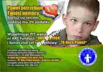 Istnieje możliwość przekazania Pawełkowi 1% podatku. To nic nie kosztuje. Wystarczy wpisać numer KRS fundacji 000[zasłonięte]7904 i w rubryce cele szczegółowy wpisać 78 Paweł Dura.