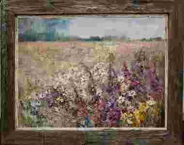 Najczęstszym tematem prac są łąki pełne kwiatów, postacie i kobiety na starych deskach.