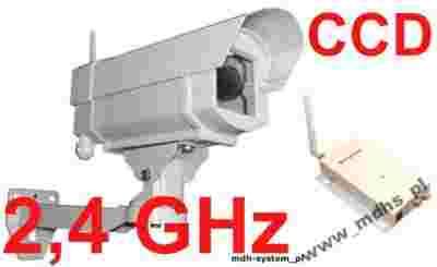 Kamera bezprzewodowa CCD (zasięg transmisji obrazu + dźwięk do 100m) z obiektywem 4 mm (74 stopnie), 420 linii TV, 0,1 lux, nadajnik 2.4GHz, obudowa zewnętrzna z grzałką i termostatem