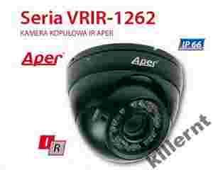 VRIR-1262 to nowa seria kamer Aper w wandaloodpornych obudowach z wbudowanymi promiennikami IR, do montażu wewnętrznego i zewnętrznego. Zastosowano w nich obudowę w kształcie ściętej sfery i dodatkowy pierścień umieszczony na obiektywie, dzięki którem wyeliminowano refleksy powstające podczas świecenia promiennika. 36 diod zapewnia bardzo dobre oświetlenie sceny podczas nocnej pracy kamery. Regulowanie położenia odbywa się we wszystkich trzech osiach, dzięki czemu kamera może być umieszczona w dowolnym miejscu (zarówno na suficie jak i na ścianie). Urządzenia wyposażono w bardzo dobrej jakości przetwornik Sony Super Had 1/3” zapewniający rozdzielczość 420 (VRIR-1262N312) lub 540 (VRIR-1262H312) linii telewizyjnych oraz wysokiej klasy obiektywy o zmiennej ogniskowej 2,8~12 mm i korekcji IR. Czułość kamer w trybie kolorowym wynosi 0,5 lx. Całość została zamknięta w metalowej obudowie o klasie szczelności IP66 odpornej na akty wandalizmu i niesprzyjające warunki atmosferyczne. Kamery posiadają automatyczny bilans bieli (ATW), funkcje kompensacji oświetlenia tła (BLC), automatyczną elektroniczną migawkę (AES) oraz funkcję ColorCut. Zasilane są prądem stałym o napięciu 12 V.