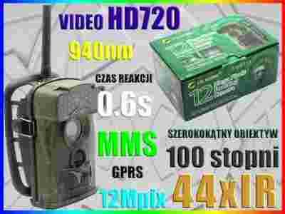 12Mpix,  nagrywaniem video HD HD720 - 1280x720, szerokokątnym obiektywem - 100 stopni oraz ultrakrótkim czasem reakcji - ok. 0.6sekundy, urządzenie dodatkowo wyposażone jest w moduł MMS/GPRS pozwalający na otrzymanie MMSa lub E-Maila ze zdjęciem po wykryciu ruchu.