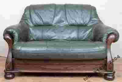 Mebel pokrywa gruba naturalna skóra w kolorze ciemno zielonym.