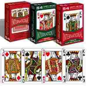 KARTY INTERNATIONAL - nowe karty. WYPRZEDAŻ detaliczna w cenach hurtowych. Talia do brydża zawiera 54 kart (52 karty + 2 jokery) plus jedną kartę z zasadami gry i zapisu brydżowego. Kartami można grać również w inne popularne gry karciane: kanasta, remik, poker itp. Wysokiej jakości karty zostały wyprodukowane w Polsce na profesjonalnym kartonie karcianym (dwuwarstwowym z czarnym filtrem).
