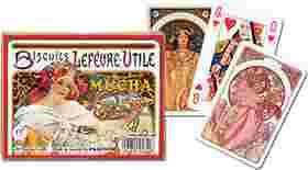 W komplecie 2 talie w eleganckim, złoconym pudełku z charakterystyczną Piatnikowską poduszeczką. Na rewersach (koszulkach) i na pudełku obrazy słynnego czeskiego grafika i malarza Alfonsa Muchy. Talie składają się z 55 plastikowanych kart o wymiarach 58 x 89 mm i gramaturze 310. Idealne zarówno do brydża, pokera, remika jak i innych gier.