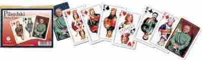 Najwyższej jakości karty do gry renomowanej firmy Ferd. Piatnik & Sohne wyprodukowane na specjalne życzenie polskich odbiorców. W komplecie 2 talie w eleganckim, złoconym pudełku z charakterystyczną Piatnikowską poduszeczką. Na awersach postaci z "Pocztu królów polskich". I tak na przykład walet karo to Mieszko I, dama trefl - Marysieńka, a król kier - Władysław Jagiełło. Na rewersach wizerunki Józefa Piłsudskiego. Talie składają się z 55 plastikowanych kart o wymiarach 58 x 89 mm i gramaturze 310. Idealne zarówno do brydża, pokera, remika jak i innych gier. Wyroby wiedeńskiej fabryki Ferd. Piatnik & Sohne od 1824 roku urzekają bogactwem wzorów i perfekcją wykonania. Jakość i tradycja!