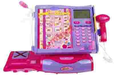 DOTYKOWA KASA SKLEPOWA z akcesoriami (3213). Prezentowana kasa sklepowa wyposażona jest w dotykowy panel z wymienną listą produktów, mikrofon, czytnik kodów, czytnik kart oraz wygodną podstawę. Ma działający kalkulator i otwieraną szufladkę z pieniędzmi. Wszystkie te udoskonalenia do sklepu to oferta dla wyjątkowo wymagających pociech.