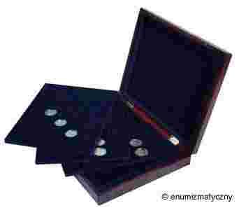 Kategoria: akcesoria numizmatyczne Kaseta do przechowywania 105 monet 2 zł w kapslach Idealna także dla monet 2 euro w kapslach Kaseta wykończona jest w kolorze mahoniu, zawiera 3 welurowe palety (każda na 35 monet), oraz magnetyczne zamknięcie. Wymiar kasety: 330 x 270 x 55
