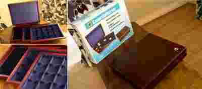 Sprzedam używaną, ale bardzo zaszanowaną ekskluzywną kasetę do przechowywania monet. Jest to potrójna kaseta z najwyższej serii Volterra firmy Leuchtturm. Każda paleta jest w drewnianym obramowaniu - to wyróżnia najwyższy model w tej serii przeznaczony do przechowywania monet w holderach lub opakowaniach Quadrum.