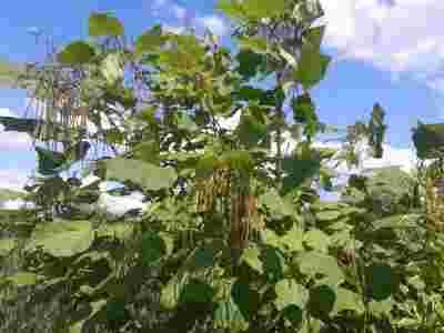 Surmia Katalpa jest szybko rosnącym drzewem dorastającym do 10 m. wysokości. Ma biało-kremowe kwiaty o egzotycznym wyglądzie, z żółtym środkiem i fioletowymi kropkami.