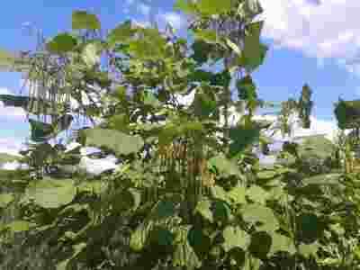 Surmia Katalpa jest szybko rosnącym drzewem dorastającym do 10 m. wysokości. Ma biało-kremowe kwiaty o egzotycznym wyglądzie, z żółtym środkiem i fioletowymi kropkami.