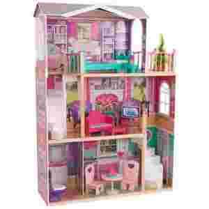 Zabawa domkiem pobudza do kreatywnej zabawy i odgrywania ról dorosłych Trzy piętra, 4 pomieszczenia Piękne, kolorowe dekoracje ścienne. Otwarta przestrzeń umożliwia wspólną zabawę 12 olbrzymich i kolorowych, najwyższej jakości mebelków i akcesoriów Białe, szerokie schody na dwóch kondygnacjach Duży słoneczny taras Królewskie łoże Szerokie dwustronne okna umożliwiają zaglądanie do środka pod różnymi kątami Rozmiary domku umożliwiają zabawę kilkorgu dzieciom jednocześnie Wykonany z drewna Wytrzymała i solidna konstrukcja Pasuje do wszystkich lalek do 46 cm wysokości.Olbrzymie wymiary : wys 167 cm x szer 121 cm x 46 cm gł