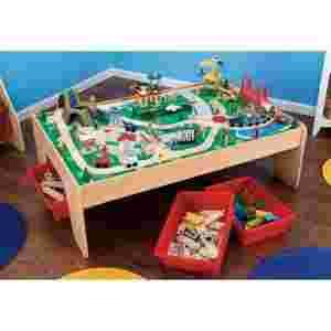 Zestaw wykonany z drewna kompozytowego i materiałów z tworzywa sztucznego. Narduk sitodrukiem. W zestawie znajdują się akcesoria: góra z tunelem i wodospadem, samochody, figurki, znaki drogowe, drzewa, domki, most, dźwig, lotnisko, stacja benzynowa itp. Dodatkowo 3 pojemniki do przechowywania zabawek. Duży stół ok. 120x90 cm, wys ok. 40 cm. Brak ostrych krawędzi i solidna konstrukcja. Produkt amerykański, posiada instrukcję z polskim tłumaczeniem.