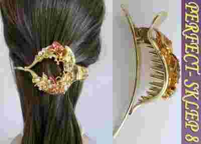 • Klamra do włosów wykonana z metalizowanego plastiku, w kolorze złotym na wysokogatunkowej sprężynie dzięki której można wykonać przeróżne fantazyjne fryzury, bez obaw że ulegną popsuciu.
