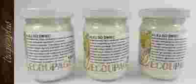 Bezbarwny klej, który doskonale nadaje się do przyklejania do świec motywów wyciętych z serwetek lub papieru ryżowego. Klej należy nałożyć na świecę, przyłożyć motyw wycięty z serwetki lub z papieru i docisnąć. Po wyschnięciu najlepiej ponownie ponownie pomalować klejem stosując go podobnie jak bezbarwny werniks ochronny. Świecę można bezpiecznie spalać. Dekoracja nie dymi i nie wydziela zapachów oraz nie zapala się przy stopniowym zużywaniu świecy.
