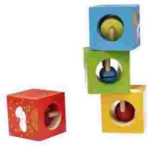 Dodatkowo każdy z klocków ma ukrytą w środku niespodziankę, która czeka na odkrycie. Grzechotające, piszczące i stukające elementy zaciekawią dziecko. Każdy klocek ma inną niespodziankę w środku dzięki czemu wydaje inny dźwięk. Klocki mają nieregularny kształt z otworem, aby dodatkowo zachęcić do ich badania i tym samym ćwiczenia sprwności paluszków.