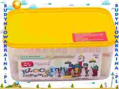 - plastikowe wiaderko z pokrywką wyposażoną w otwory w kształcie klocków,
