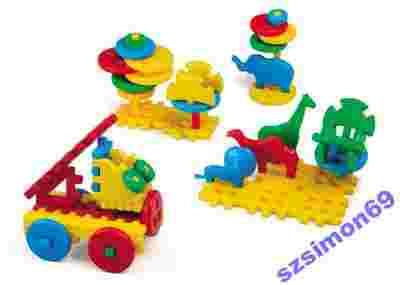 Z 50 ELEMENTÓW (zestaw zawiera m.in. podstawowe klocki, zwierzątka,koła, itp.)