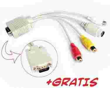 - Końcówki w adapterze: 1x VGA (wyjście monitora, 15 pin męskie), 1x gniazdo S-VHS/S-Video (S-Video Mini Din 4 pin żeńskie), 3x RCA-gniazdo (żeńskie)