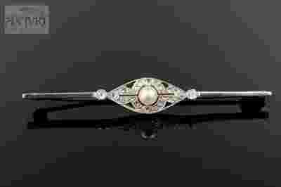 Rasowe ART DECO - złota broszka z 22 diamentami ( łącznie 0,18 ct) i hodowlaną morską