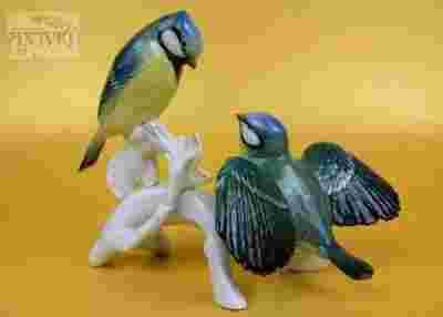 Figurka przedstawiająca parę ptaków - sikorek modrych na gałęzi sygnowana Volkstedt, Porzellanfabrik Karl Ens, sygnatura stosowana po II wojnie światowej, od 1945 roku. Figurka ręcznie malowana. Zachwyca paletą barw oraz niezwykłą dbałością o szczegóły.