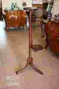 Smukły kwietnik na potrójnej nodze z początku XX wieku. Wykonany z liściastego drzewa barwionego na mahoń, posiada dwie podstawki na kwiaty.