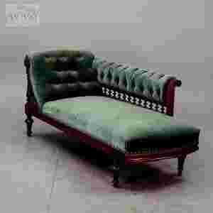 Piękny szezlong w stylu gustawiańskim, pochodzący z końca XIX wieku. Konstrukcję stanowi drzewo liściaste fornirowane mahoniem. Mebel zdobiony licznymi toczonymi tralkami, które dodają lekkości i niepowtarzalnego charakteru. Tapicerka welurowa w kolorze morskiej zieleni, częściowo pikowana, mocowana na brzegach nitami, co tworzy go jeszcze bardziej zdobnym. Siedzisko na sprężynach.