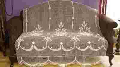 Firanki w całości wykonana ręcznie. Na ręcznie wiązanej, bawełnianej siatce w kolorze białym, naniesiony ręczny haft w kolorze kremowym i białym. Dekorowana dużym szlaczkiem o motywie kwiatowym w stylu secesyjnym. Kremowa część haftu z lekkim połyskiem.