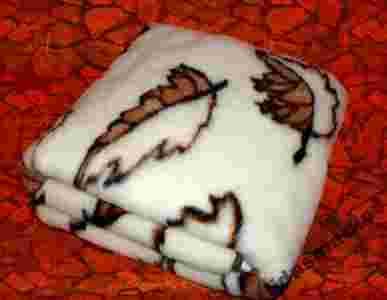 Przepiękny koc wełniany - wykonany z 100 % wełny Merynosa australijskiego w przepiękne liście , estetycznie wykończony usztywniającą lamówką.