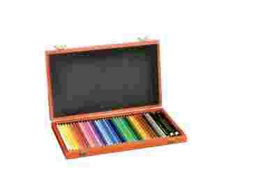 Zestaw kredek artystycznych w drewnianej skrzyneczce.