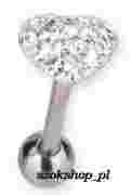 Przedmiotem aukcji jest kolczyk do języka zakończony serduszkiem z zatopionymi białymi kryształkami. Kolcyzk pokryty jest żywicą epoksydową, nie drażni podniebienia a kryształki nie wypadają.
