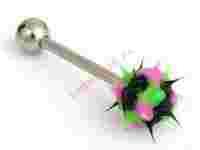 Przedmiotem aukcji jest kolczyk do języka z silikonową nakładką w kolorze czarno różowo zielonym. Nakładki świecą w promieniach ultafioletowych.