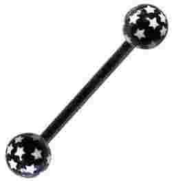Przedmiotem aukcji jest kolczyk do języka na elastycznym sztyfcie z kuleczkami akrylowymi w białe gwiazdki.
