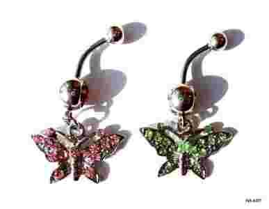 Przedmiotem sprzedaży jest kolczyk ozdobny do pępka motylek, dostępny w dwóch kolorach: różowym i zielonym. Długość banana 10 mm.Wielkość motywu ozdobnego 13,5mm/ 23,5mm. Wielkość kulek 5 i 8 mm. Kolczyk jest wykonany ze stali chirurgicznej 316 L, zdobiony różowymi lub białymi cyrkoniami w zależności od koloru kolczyka.. Prezentuje się ślicznie, jeszcze ładniej niż na zdjęciu.