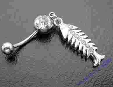 Mam dziś przyjemność zaoferować państwu kolczyk do pępka ze stali chirurgicznej 316L. Kolczyk w kształcie srebrnej rybki (a właściwie szkieletu rybki) jest wysadzany białymi cyrkoniami.